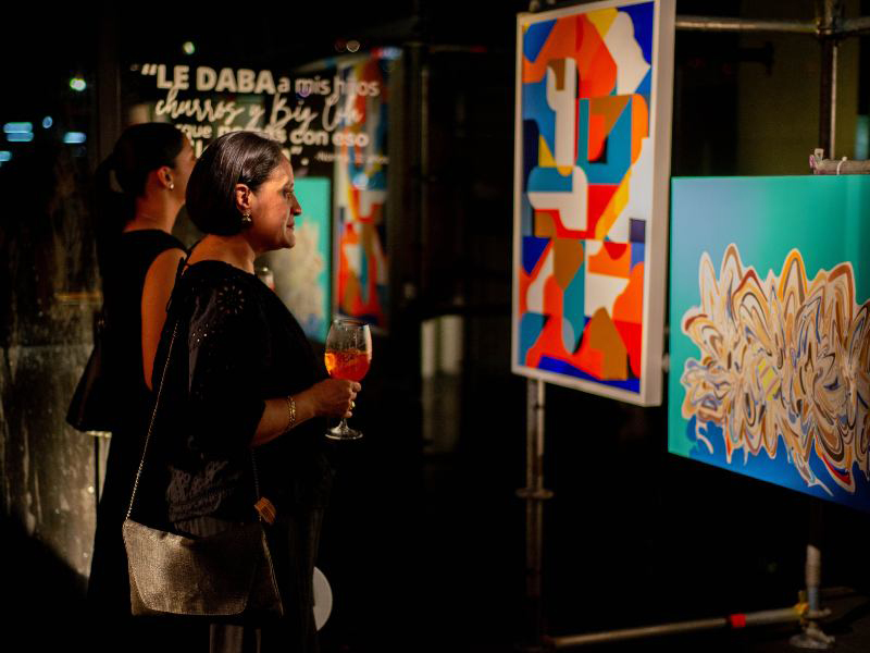La velada comenzó a las siete de la tarde, cuando los asistentes ingresaron al evento y disfrutaron de unos Aperol Spritz de Campari, helados Paulette, canapés de iLatina y la sutil música de Beto Moreno. Todo esto mientras el artista Meme Navdú pintaba una obra en vivo, que más tarde sería subastada y adquirida por más de $35,000 pesos. A la derecha del recinto, los invitados podían apreciar de cerca las obras que habían visto en el catálogo y que serían subastadas más adelante en la noche. A la izquierda, se encontraba una galería repleta de otras obras de los artistas participantes, disponibles para compra, además de una mesa con información del Organismo de Nutrición Infantil A.C., donde colaboradores compartían la causa y la razón que reunió a todos esa tarde: la enorme necesidad de México por garantizar una nutrición infantil accesible para todos y todas, en especial para niñas y niños de comunidades vulnerables, rurales e indígenas.